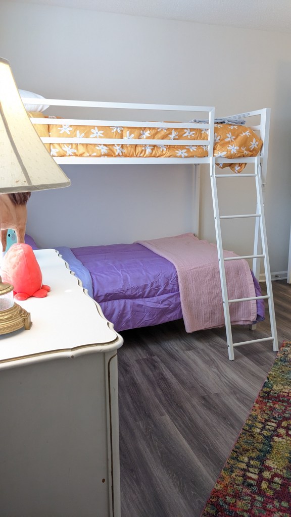 Fun Fact From Renee: “Aaron and I donated a black desk lamp to the Green Chair Project a few weeks ago. The Green Chair Project provided the furnishings for this apartment and the lamp I donated was one of the items they brought for us to use in the apartment. I am so excited that it ended up in the boy’s room!”
