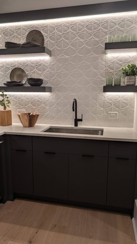 Backlighting enhances the atmosphere, while playing with different cabinet colors and wallpaper allows you to create a space that draws people in. Whether you’re serving wine, beer, cocktails, or soda, having a wet bar makes entertaining effortless and elevates your home’s social vibe.