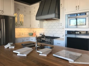 Grays and whites are still popular but we are starting to see pops of color and warmth in the kitchen. White on white is starting to phase out and people are opting for more of a marble look.