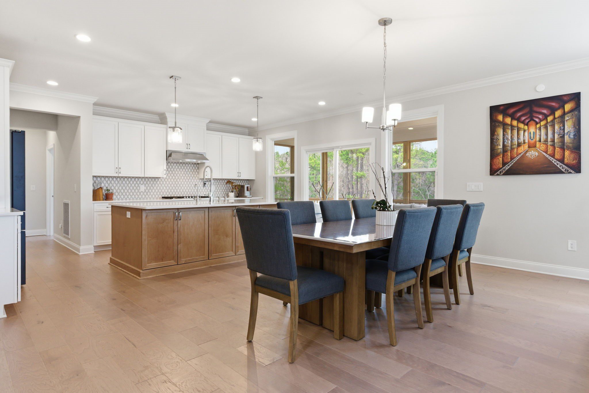 At the center, the gourmet kitchen is crisp and refined with white cabinetry, exquisite quartz countertops, and an oversized prep island built for gathering. It opens effortlessly to the dining area and expansive gathering room, where a fireplace anchors the space without overpowering it. The flow feels natural and open while still offering a clear sense of definition between rooms.
