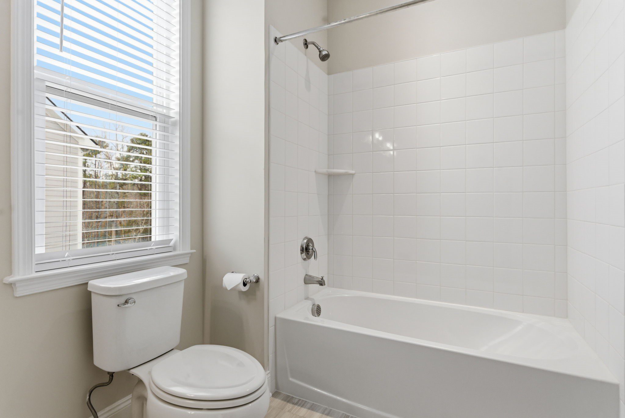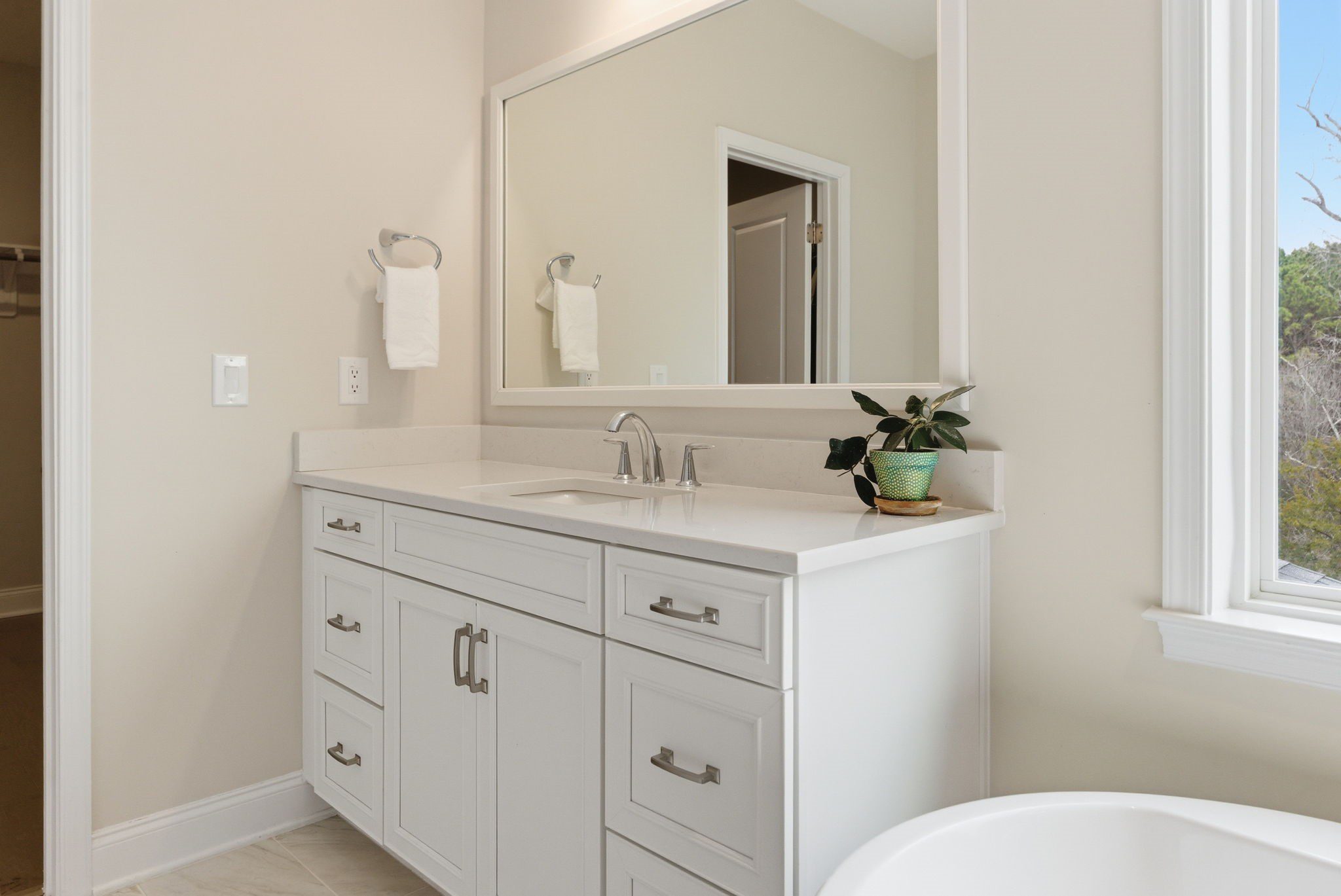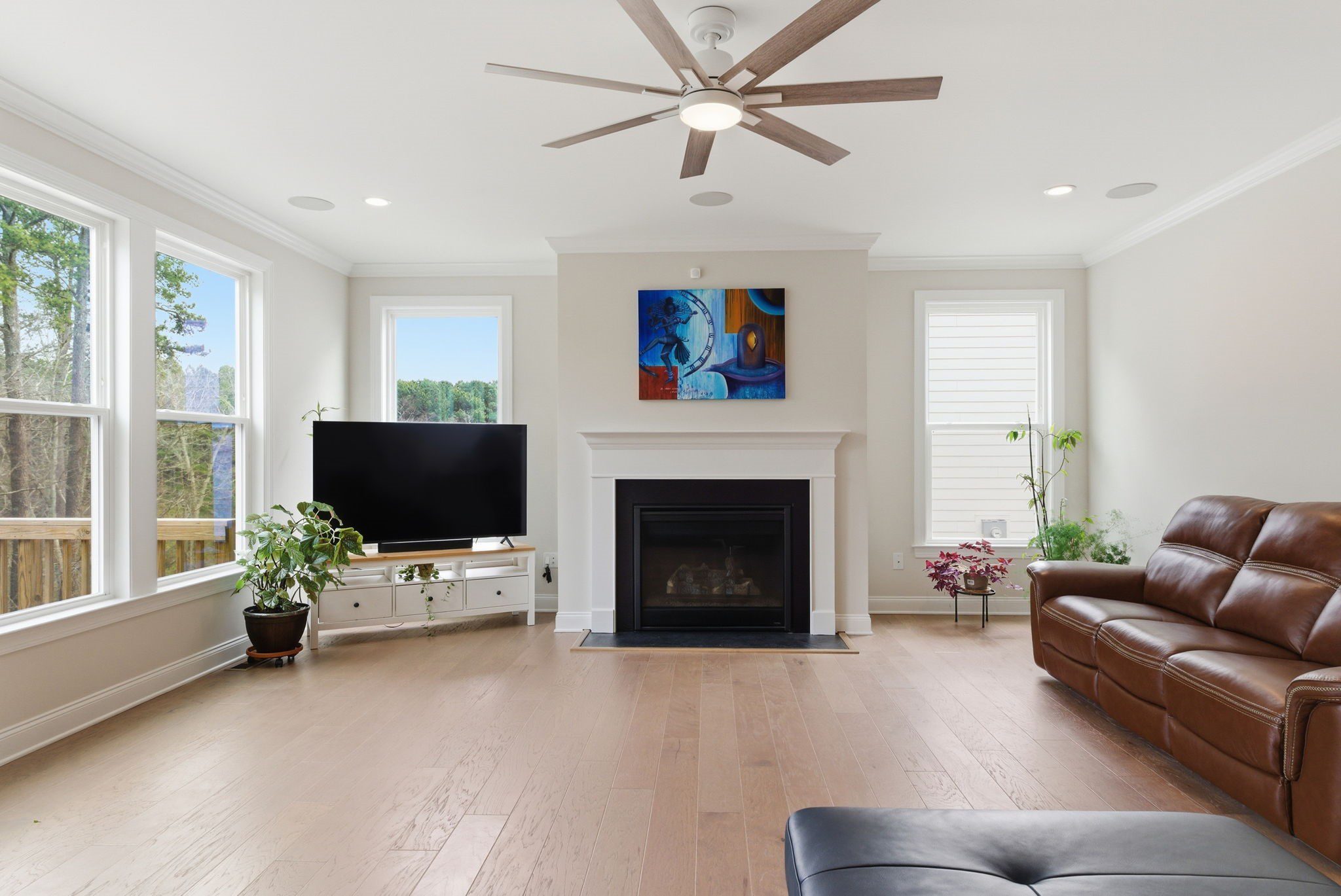Retreat upstairs via the all-wood riser staircase to a sunlit primary suite featuring triple windows overlooking protected HOA greenspace. The en suite primary bathroom is spa-inspired, highlighted by a freestanding soaking tub, an oversized walk-in shower, dual vanities, and designer tile selections that extend throughout every bathroom in the home. A loft provides additional living space, while three secondary bedrooms and a generous walk-in linen closet complete the second level.