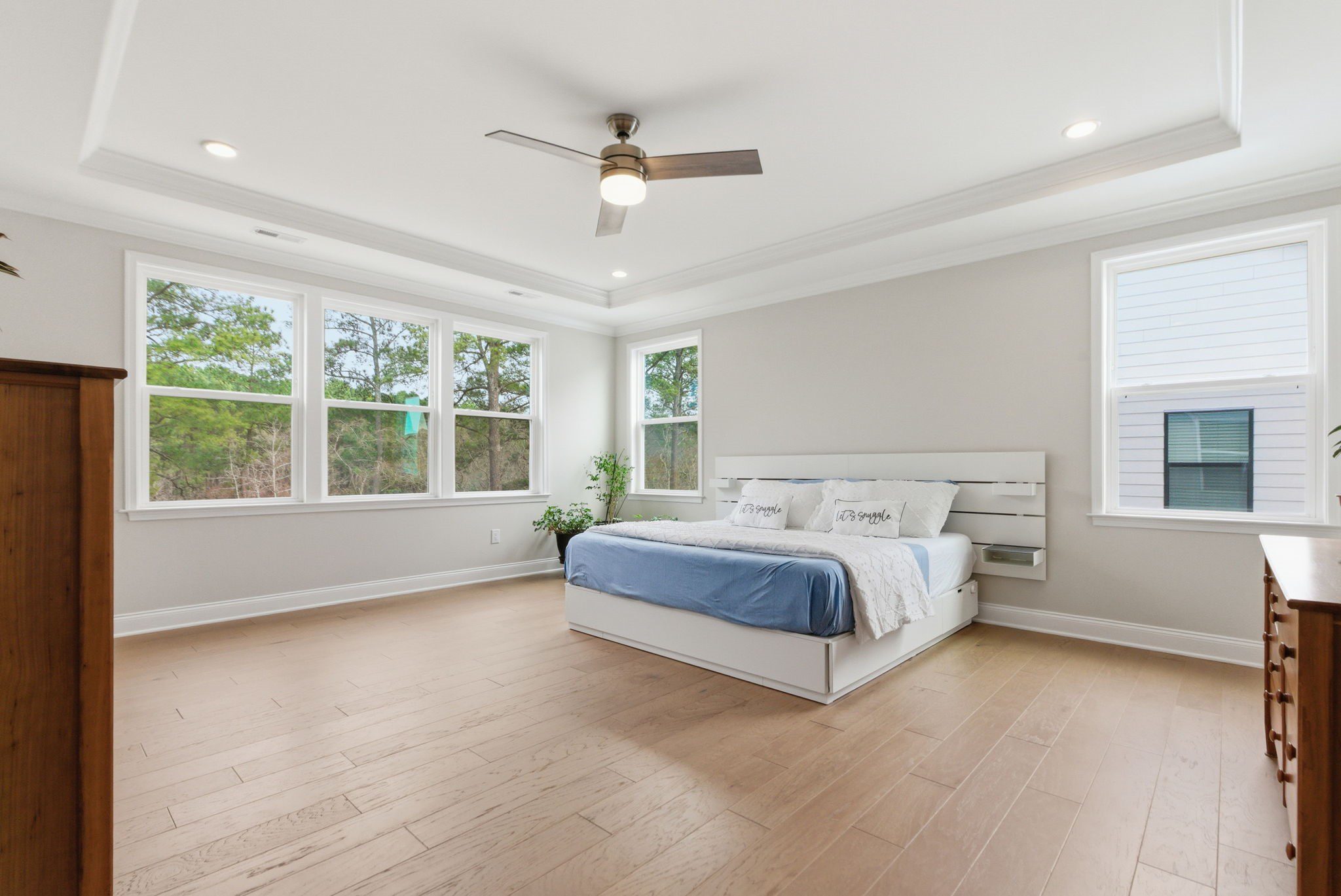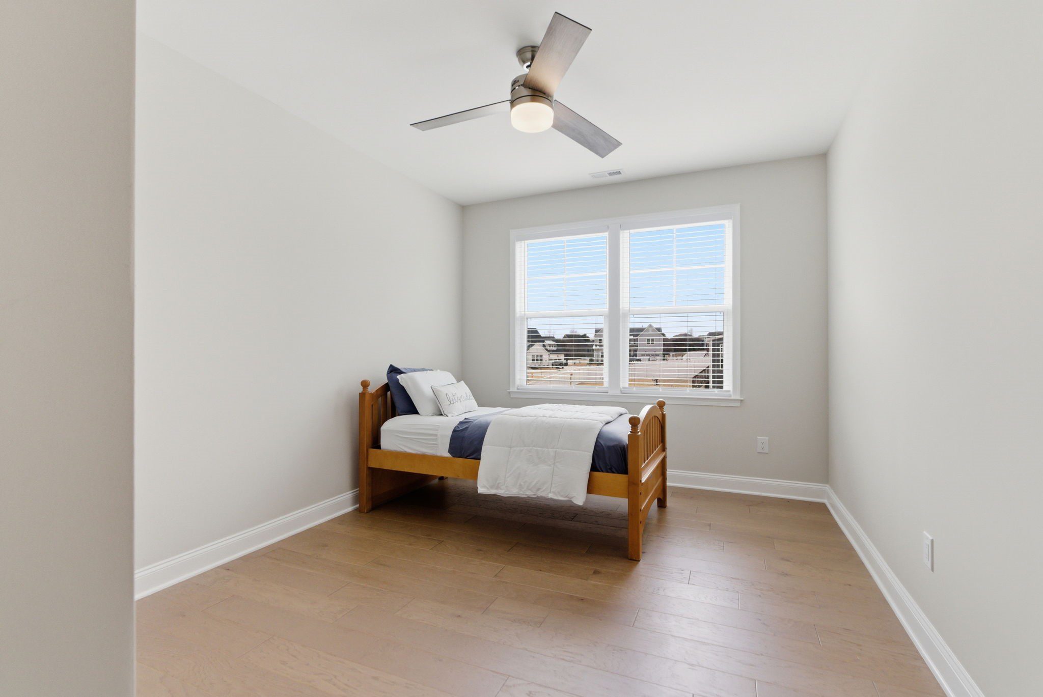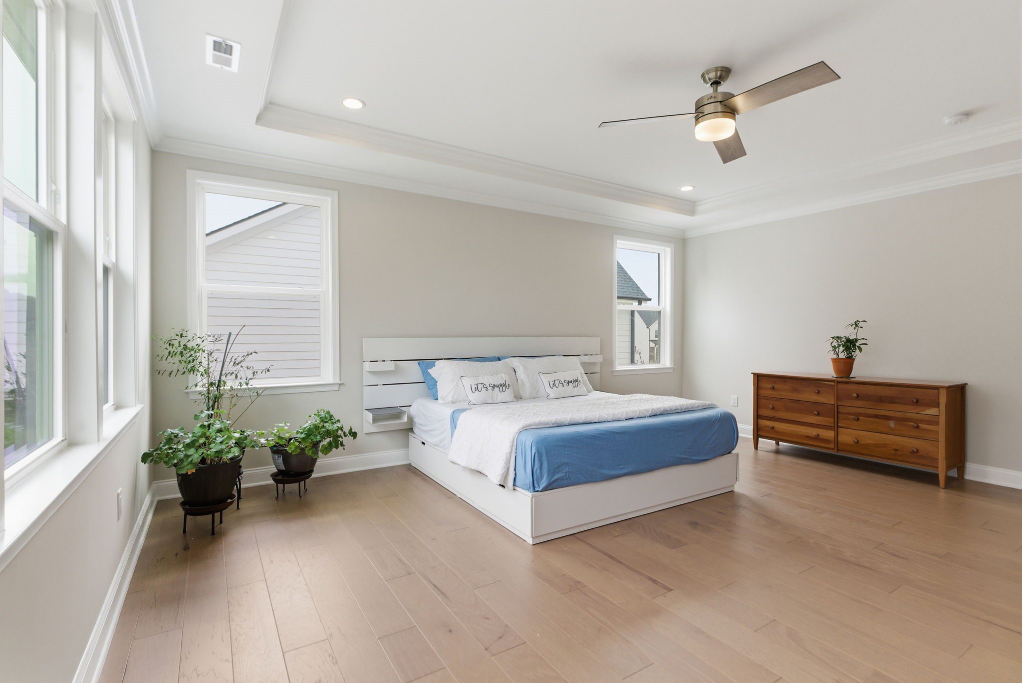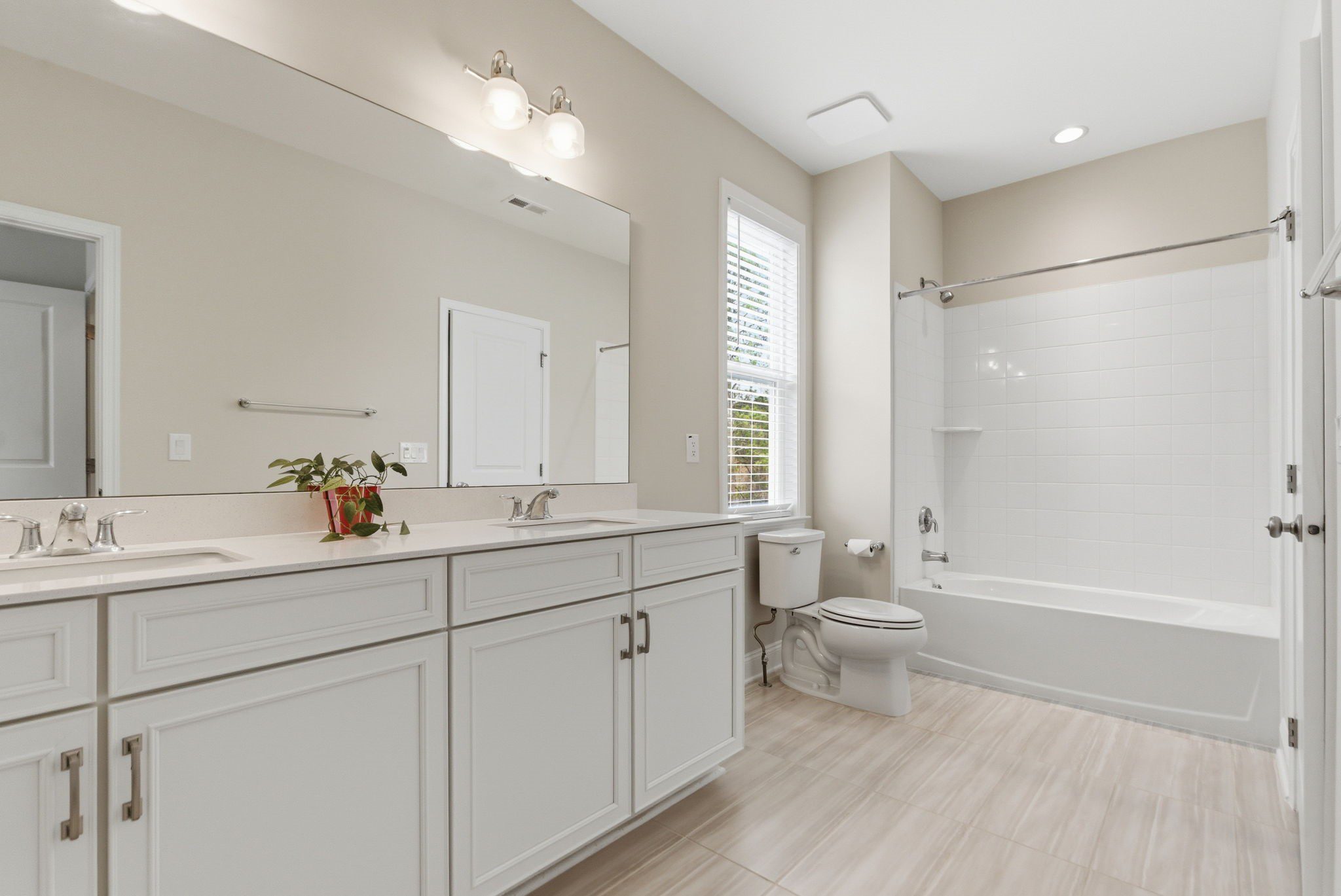 Retreat upstairs via the all-wood riser staircase to a sunlit primary suite featuring triple windows overlooking protected HOA greenspace. The en suite primary bathroom is spa-inspired, highlighted by a freestanding soaking tub, an oversized walk-in shower, dual vanities, and designer tile selections that extend throughout every bathroom in the home. A loft provides additional living space, while three secondary bedrooms and a generous walk-in linen closet complete the second level.